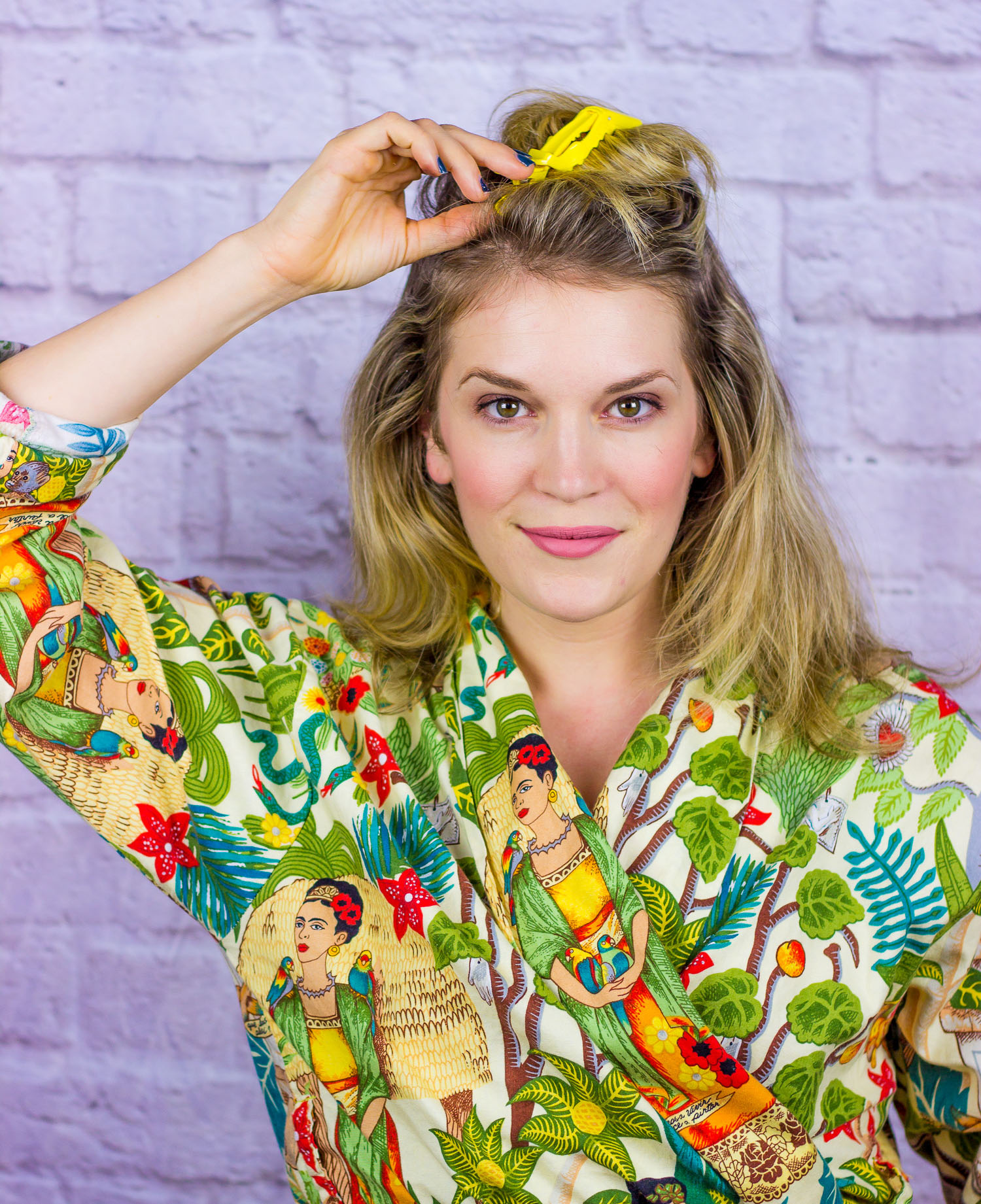 Okay you’re way more than half-way there! Now you’ve just gotta finish off the top little section. I part in the middle and then do the exact same wrap away from the head on each side. Then I spray with even more texturizing spray.