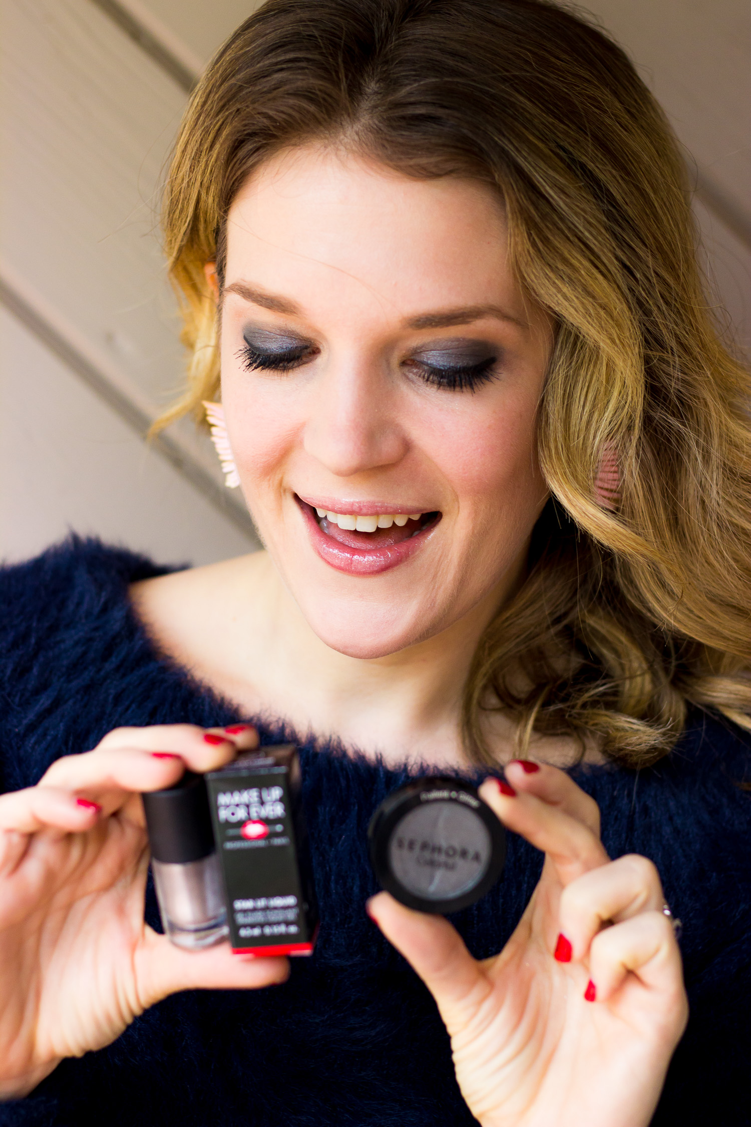 My other favorite way to wear glitter tastefully is via a smoky eye. I apply a dark glittery shadow all over the lid and BLEND IT until the cows come home. And then I blend some more. Remember from my recent everyday makeup tutorial that I also take a little shadow on my pinky and drag it along the lower lash line to complete the smoky look. I also add a black liner and then dab more glittery shadow on top of it.